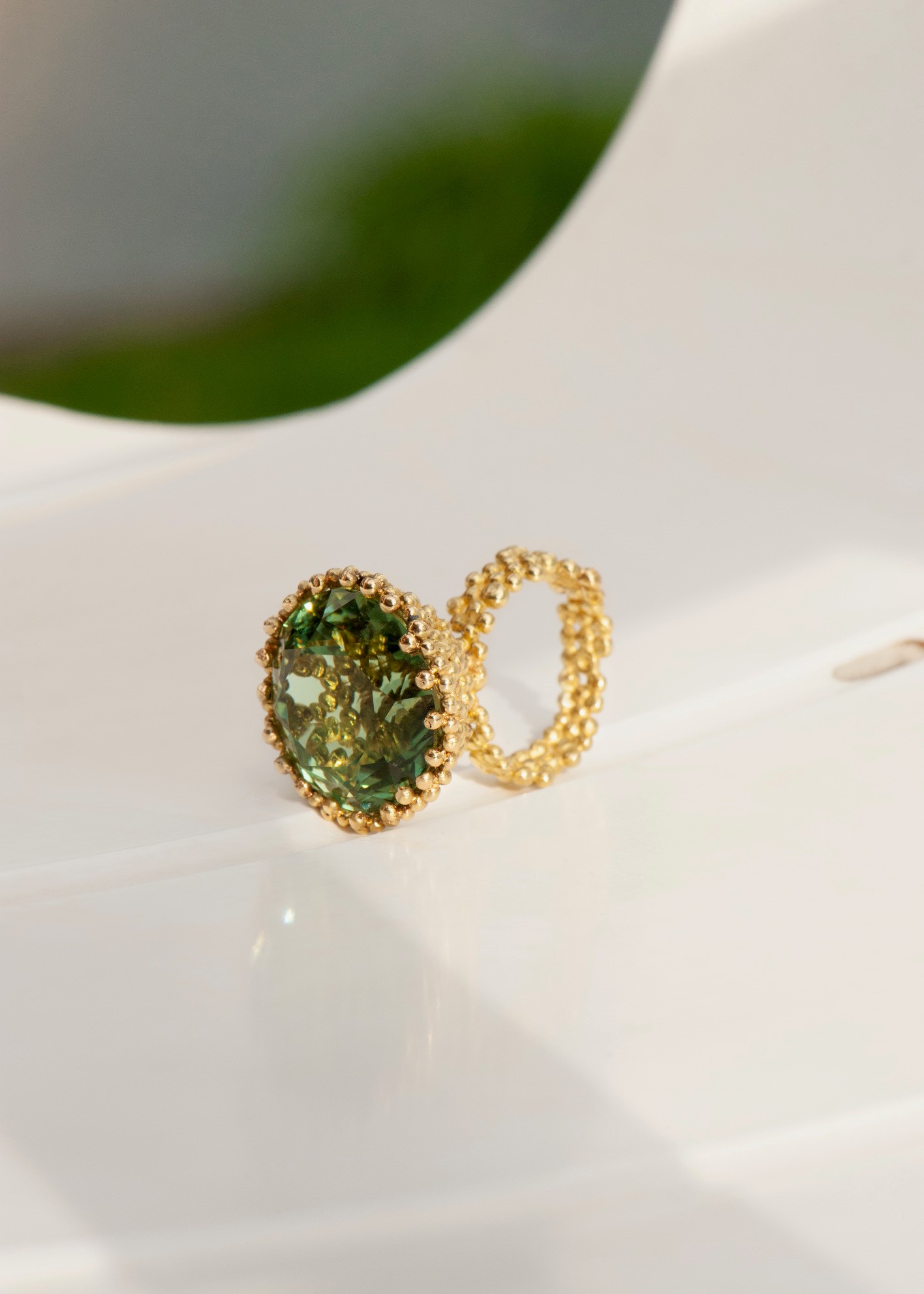 La Bague Mousse Béryl n’est pas la bague que l’on cache! elle est splendide! son béryl vert de 29,40 carat est vibrant , sa belle culasse est enchâssée dans un nid de petites boules d’or, toutes réalisées un par une, la lumière passe à travers l’or et offre un vitrail chatoyant . C’est une pièce unique… évidemment!