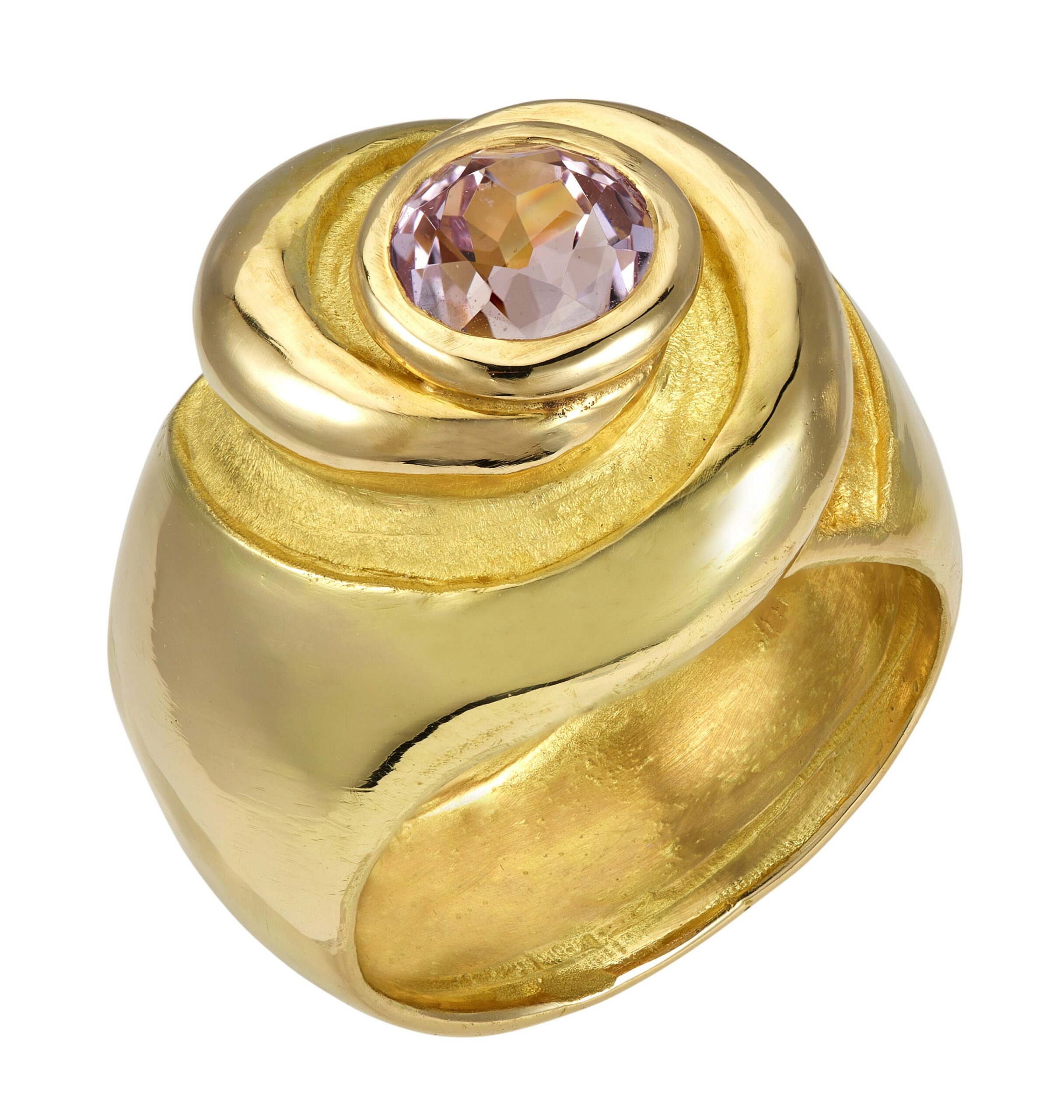 Une très jolie Kunzite, porté aux nues par une spirale d’or mat et brillant .