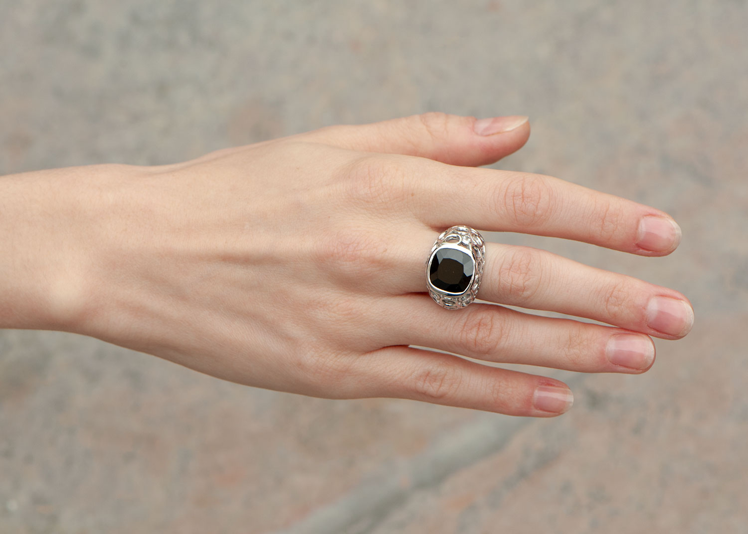 Bague bulle presque masculine, sobre avec sa pierre noire entourée de tourmalines grises. Une bague minérale .