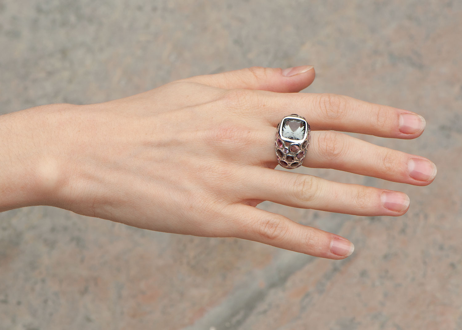 J’ai eu à un moment une vraie passion pour les pierres grises. C’était totalement inhabituel et j’ai aimé leur redonner leur titre de noblesse en les sertissant dans de l’or blanc ou du platine. Dans ces métaux neutres en couleur, les gris se sont mis à chanter et à révéler l’infini délicatesse de leur palette de couleurs. Ici la tourmaline centrale est entourée de spinelles allant du rose au gris et de saphirs padparadsha ,en cingalais « la couleur de la fleur de lotus ».