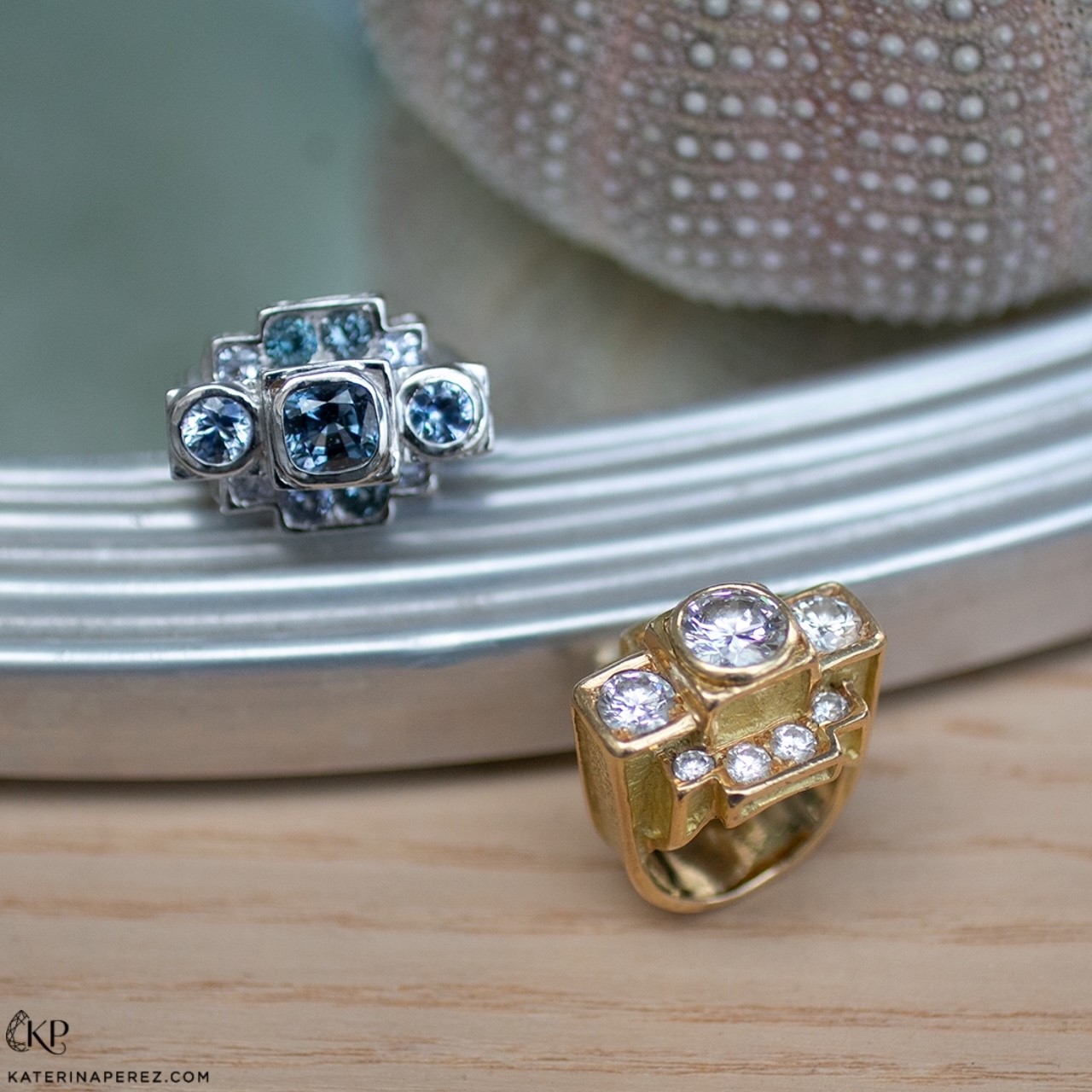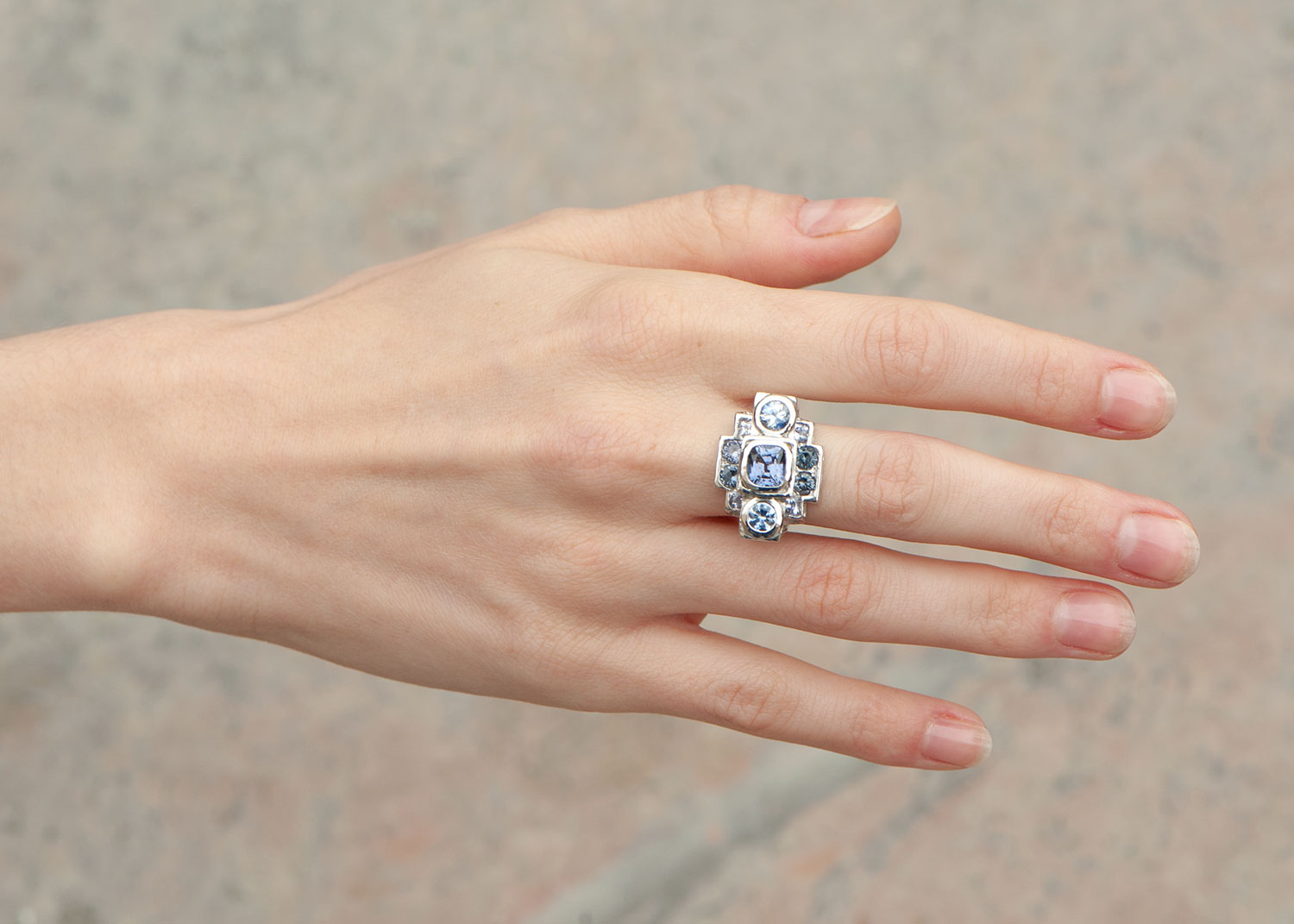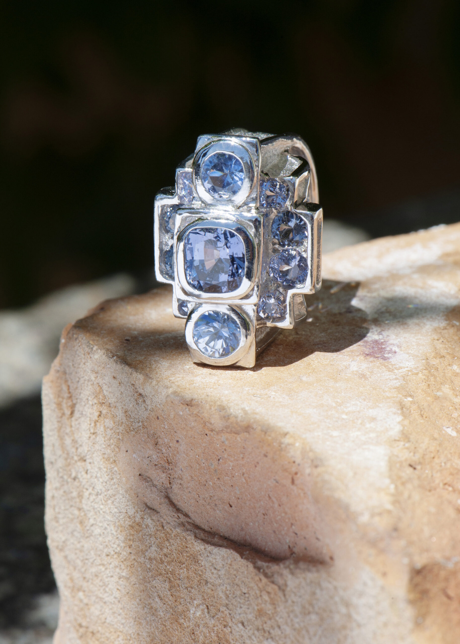 Sur cette version en or blanc , j’ai joué sur le camaïeu de bleu et de gris . Ces pierres se marient parfaitement avec le métal .